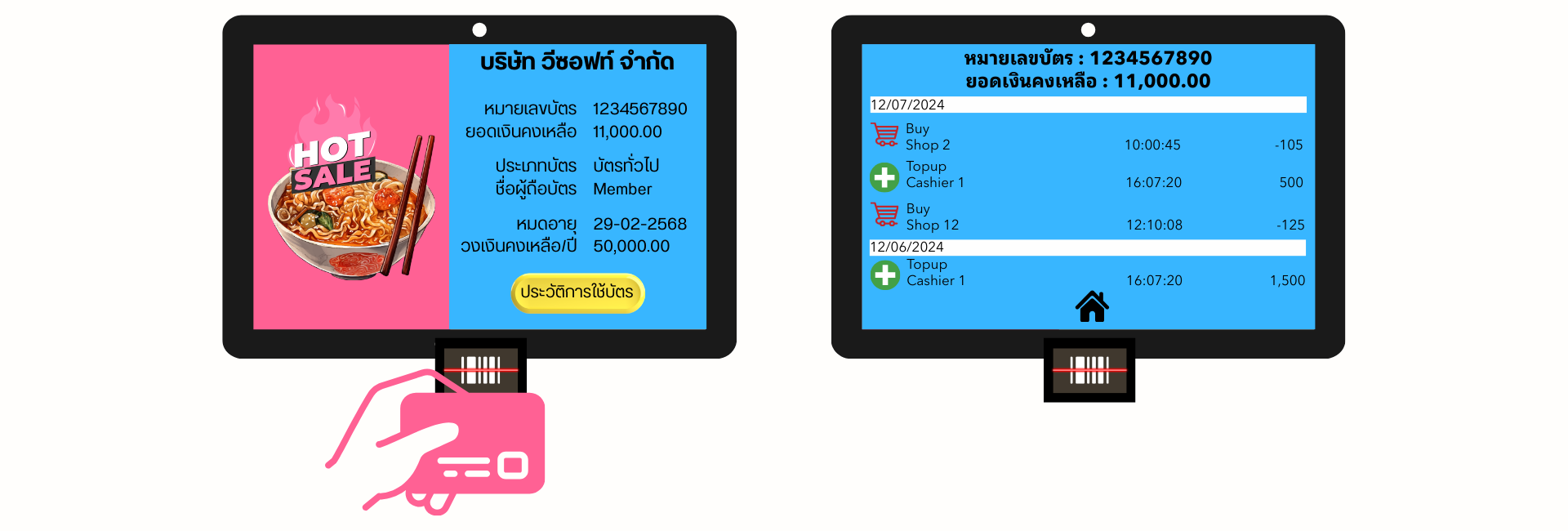 นอกเหนือจากการซื้อบัตรใหม่ เติมเงินเพิ่ม และคืนเงินคงเหลือ ณ จุดแคชเชียร์เรายังมีฟังก์ชั่นเพิ่มเติม สำหรับรองรับทั้งแบบ PC Client หรือ All in one PC Terminal พร้อมอุปกรณ์ต่อพ่วงต่างๆ ที่จำเป็น เช่น Cash Drawer, Card Reader (Barcode/RFID), Customer Display ที่เป็นทั้งแบบ Display ธรรมดา Secound Display หรือ Android Tablet และ Receipt Printer