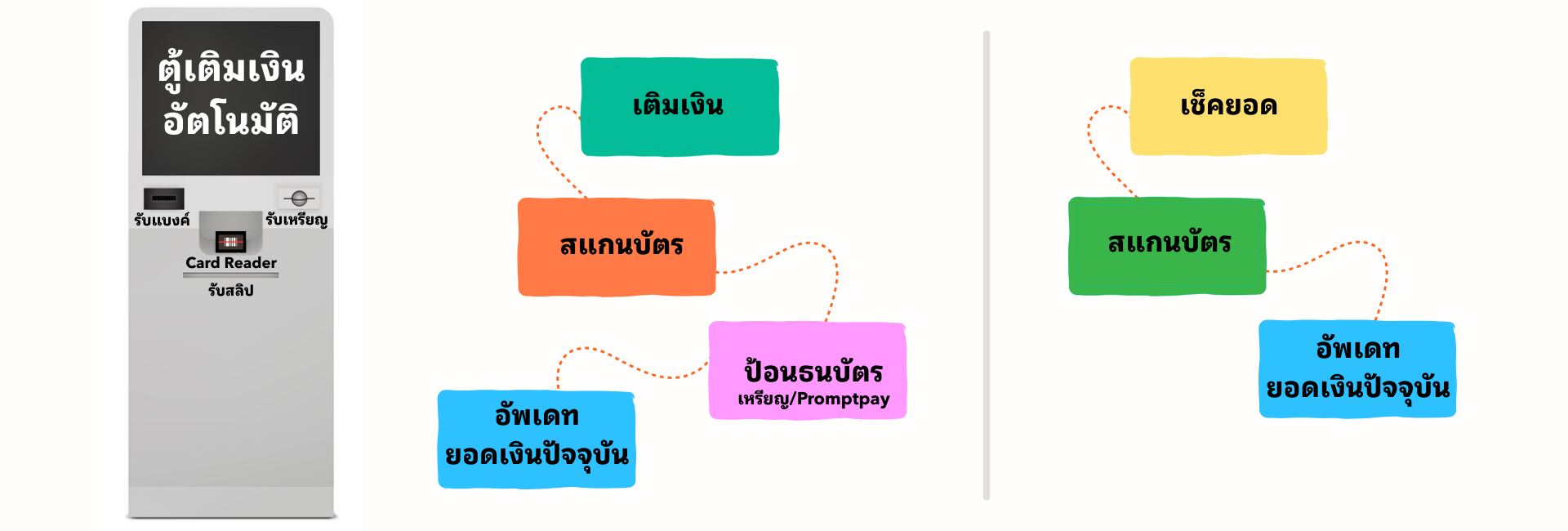 ตู้เติมเงินอัตโนมัติ ลูกค้าสามารถเติมเงินในบัตรได้เองตลอดเวลาที่ศูนย์อาหารเปิดทำการ ไม่ต้องรอคิวที่เคาน์เตอร์ และไม่ต้องพกเงินสดจำนวนมาก สามารถทำรายเพียงไม่กี่ขั้นตอน ลดความผิดพลาดจากการทอนเงิน ไม่ต้องกังวลเรื่องธนบัตรปลอม เพราะใช้เครื่องรับธนบัตรที่ได้รับการรับรอง ศูนย์อาหารสามารถลดจำนวนพนักงานที่ดูแลเคาน์เตอร์เติมเงินลงได้ ทำให้ประหยัดค่าใช้จ่ายด้านบุคลากร