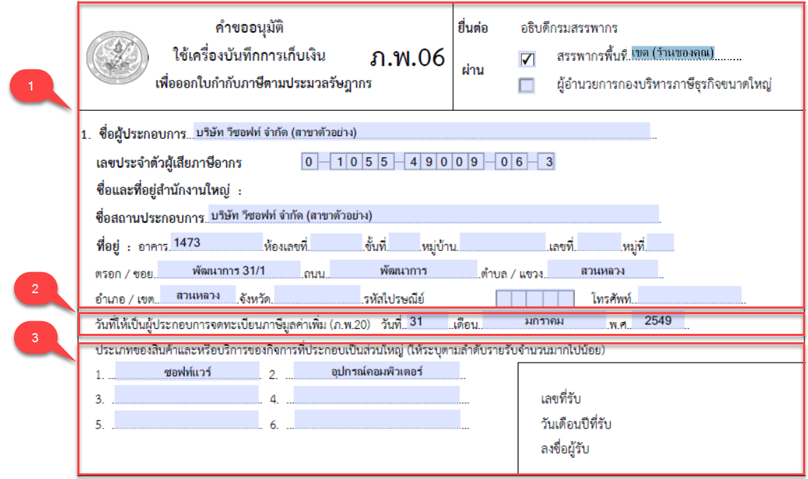 คำขออนุมัติใช้เครื่องบันทึกการเก็บเงิน ภ.พ.06